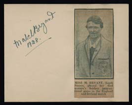 (Sports) Mabel Bryant (1885-1948), British Women's hockey player (1901-1928), considered one of the elite players of her time. Signature on 5" x 4" manila card with newspaper clipping attached and dated 1928, the year she retired (Image)