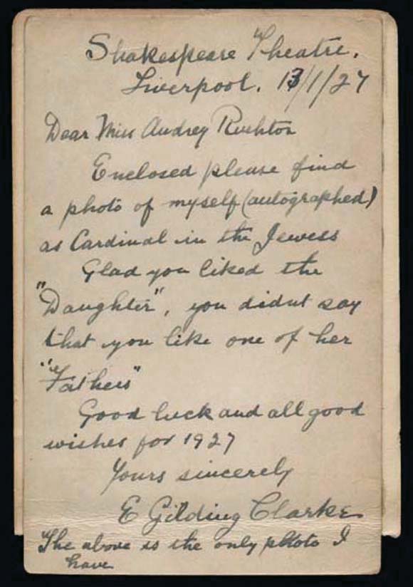 (Theater) Edwin Gilding Clarke (1873-1934), British actor and opera performer, signature here on a 3 ½" x 5½" handwritten letter to an admirer, dated 1927 from the Shakespeare Theatre in Liverpool, where he mentions sending a signed picture of himself in the role of the Cardinal in "The Jewess" and references his role as Buteux in Lecocq's "The Daughter of Madame Angot." Letter glued to cardboard for protection but with crease at bottom, slightly affecting signature (Image)