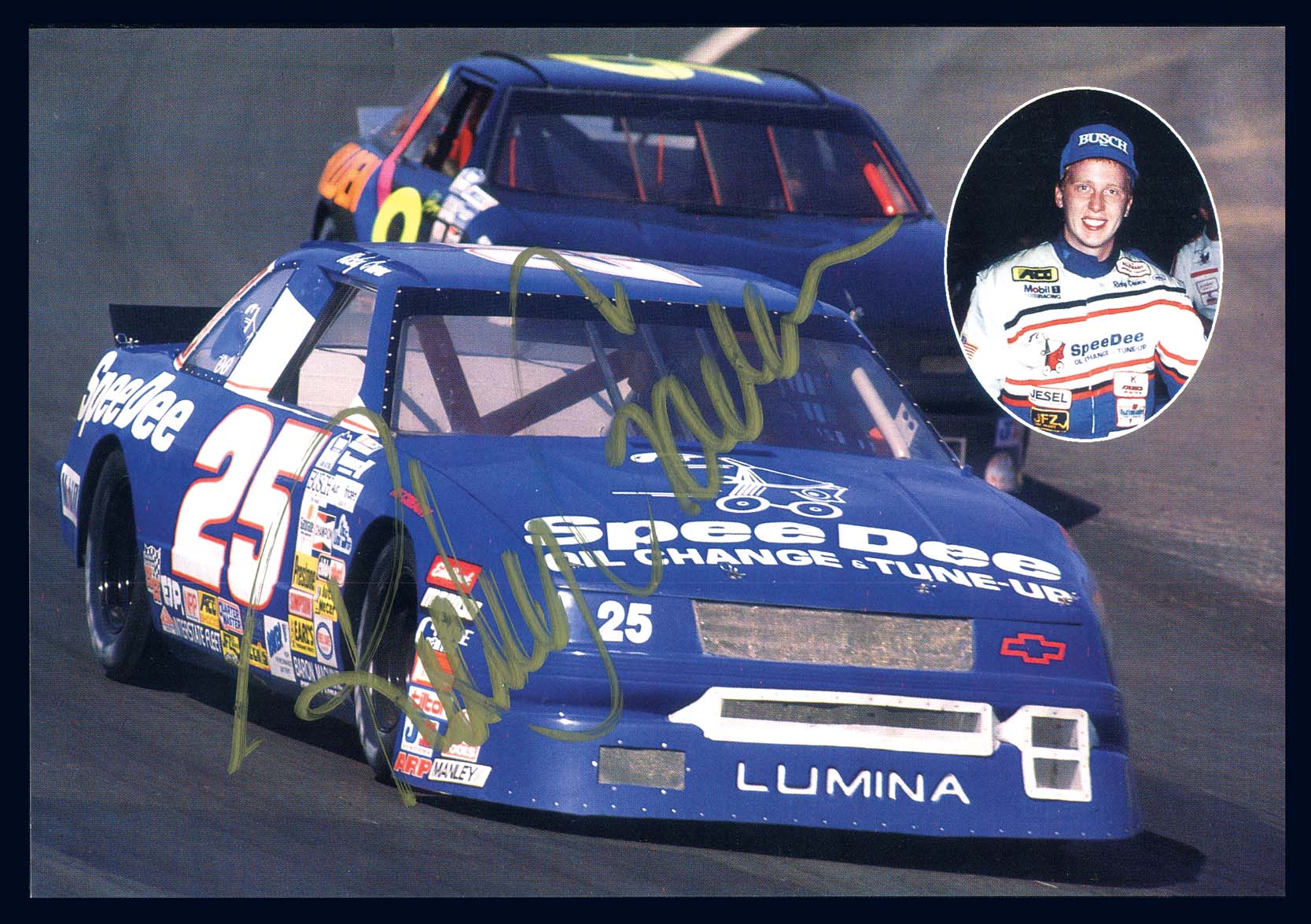 (Auto Racing) Ricky Craven (1966-), NASCAR racecar driver (1981-2006), signed in gold on SpeeDee Oil Change & Tune-Up 6" x 5 1/2" advertising card showing his information, team info and 1990-1991 stats and accomplishments plus SpeeDee's services on one side and the other side with color picture of Craven and his Chevy Lumina. 1991 NASCAR Busch North Series champion (Image)