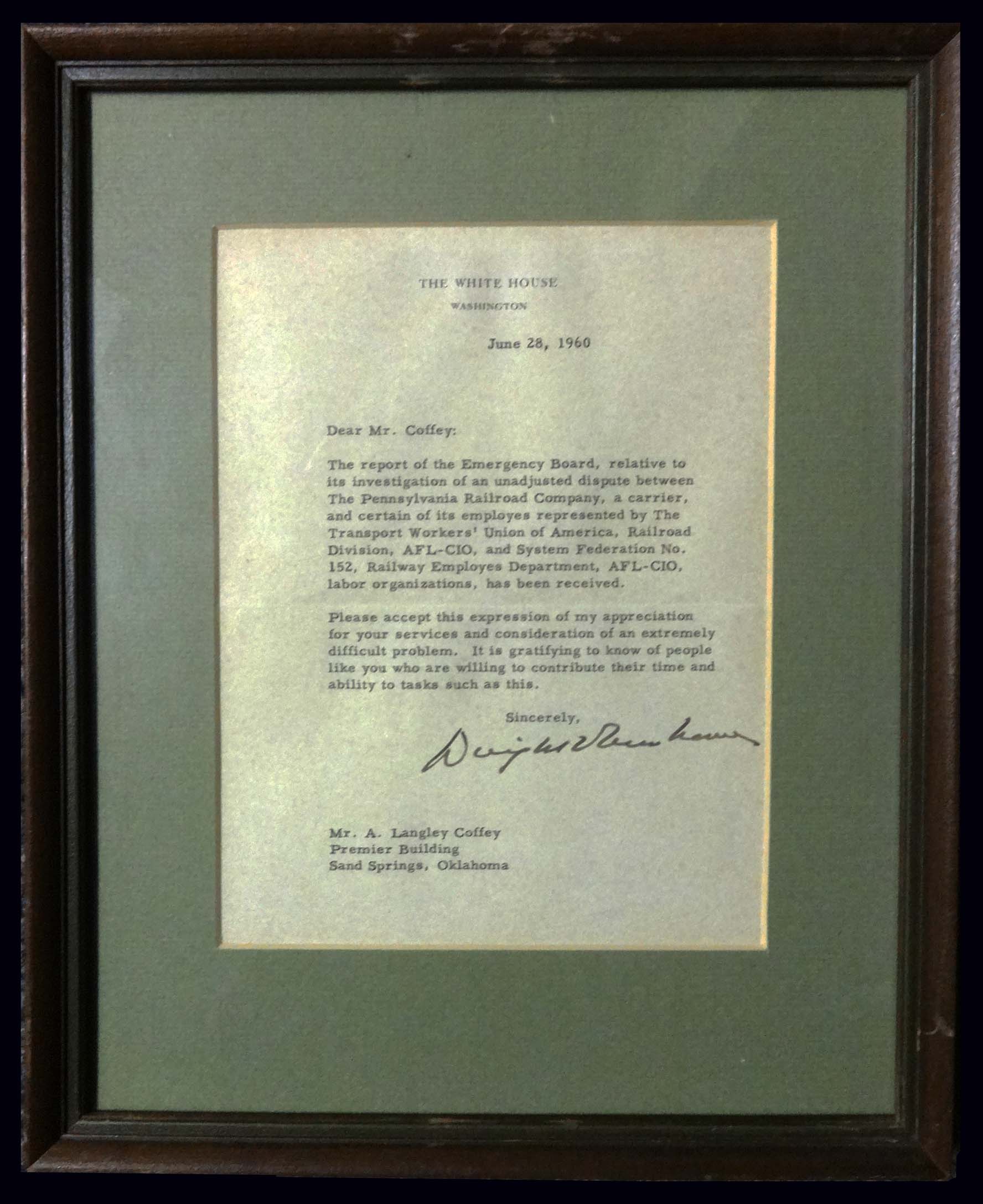 (President) DWIGHT D. EISENHOWER (1890-1969), signature on letter dated June 28, 1960 to Mr. A. Langley Coffey, verifying that Coffey's report (as a member of the Emergency Board investigating the dispute between the Pennsylvania Railroad Co. and some of it's employees, per Executive Order no. 10877) had been received. Pres. Eisenhower also expressed his "appreciation of your services and consideration of an extremely difficult problem." The letter, on "THE WHITE HOUSE" letterhead, is lightly toned, mounted in an old wooden frame with green matting (Image)