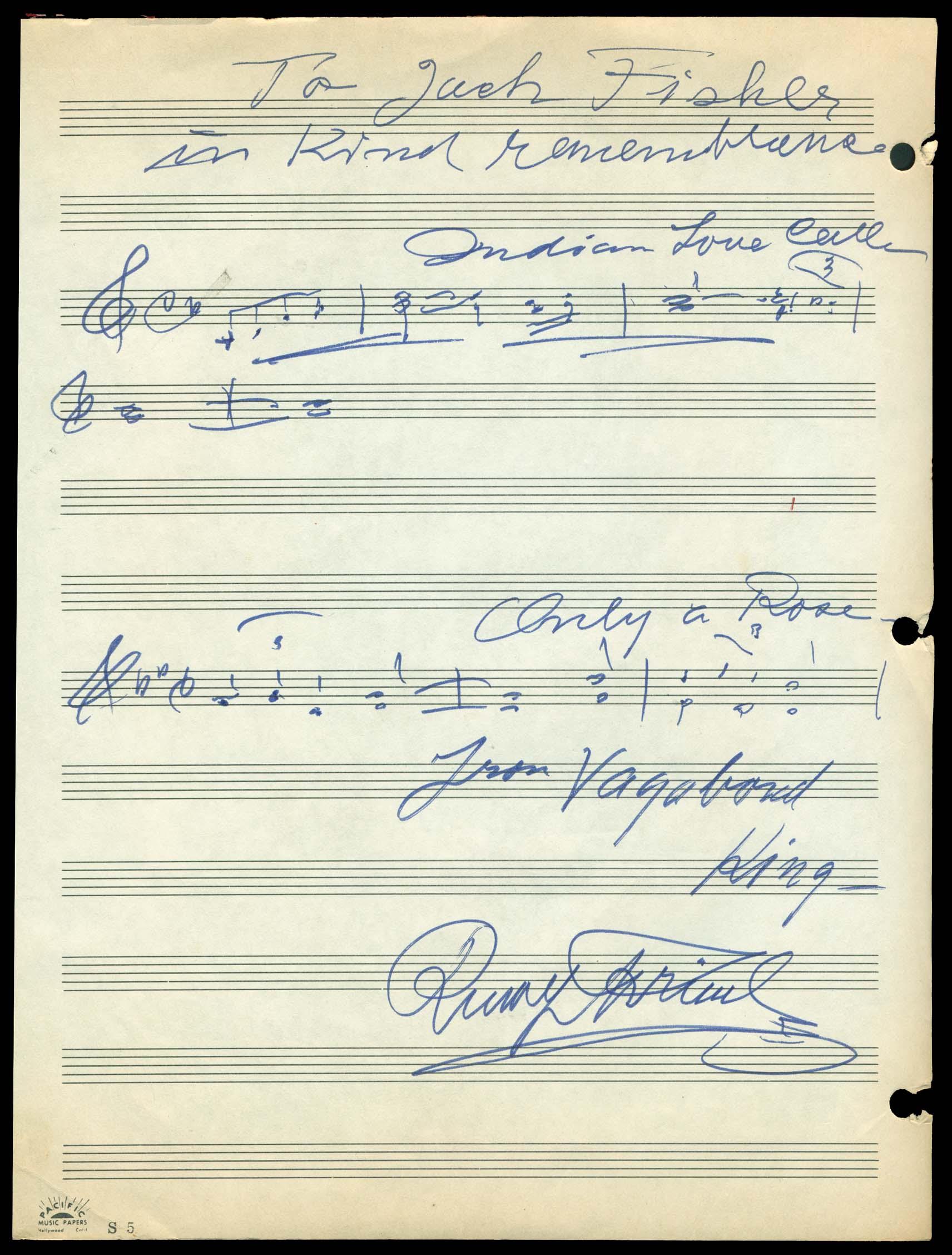 (Composer) RUDOLF FRIML (1879-1972), composer of musicals, operettas, songs, etc. from 1900's-1940's. Here signed 8½"x11" music sheet with couple of his most popular musical scores, "To Jack Fisher/in kind remembrance/Indian Love Call/(musical score)/Only a Rose/(musical score)/from Vagabond/King/(signature) Rudolf Friml." Indian Love Call is from the operetta 'Rose-Marie' in 1924 and 'Vagabond King', a 1925 operetta Cat($750) (Image)