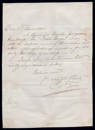 (Author) Catherine Gore (1798-1861), novelist of about (70) books from 1823-1858 plus she wrote (11) plays which made it onto the London stage. Here, she has signed a short, undated letter, closing with "I am glad to hear that Lady Sizemore is better." (Image)