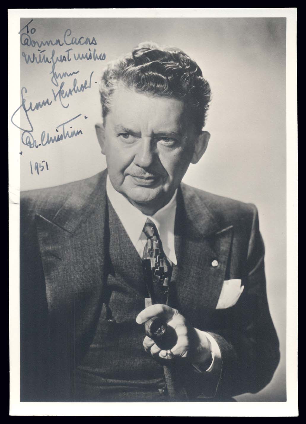 (Entertainment) Jean Hersholt (1886-1956), born Jean Pierre Carl Buron in Copenhagen, Denmark, an actor whom worked in film, radio, television and on the stage. Best known as the star of the CBS radio series Dr. Christian for (17) years (1937-1954). He co-starred with Shirley Temple in the 1937 movie "Heidi". Signature on 5x7 publicity photograph with inscription. Also, signed "Dr. Christian" and dated 1951 (Image)