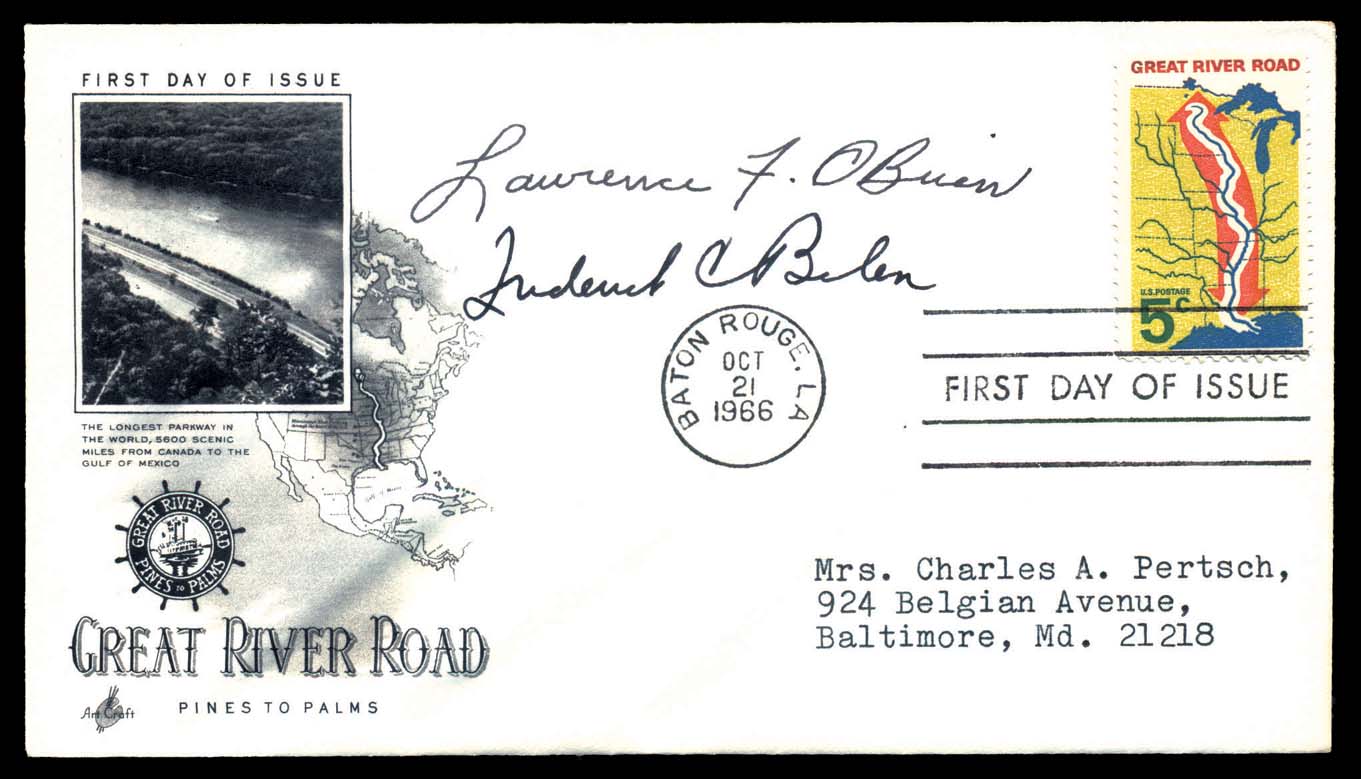 (Postmaster) Lawrence O'Brien (1917-1990), U.S. Postmaster General 1965-1968, under Pres. Lyndon B. Johnson and Commissioner of the National Basketball Assoc. (NBA) 1975-1984. He was also in the motorcade in Dallas, TX when Pres. John F. Kennedy was assassinated. Here, his signature on Artcraft FDC for #1319 and with autograph of Frederick C. Belen, (1913-1999), the deputy U.S. Postmaster General 1964-1969, who helped to create the Zip Code System under PMG Gronousky and continuted to implement it and "work out the bugs" under PMG O'Brien (Image)