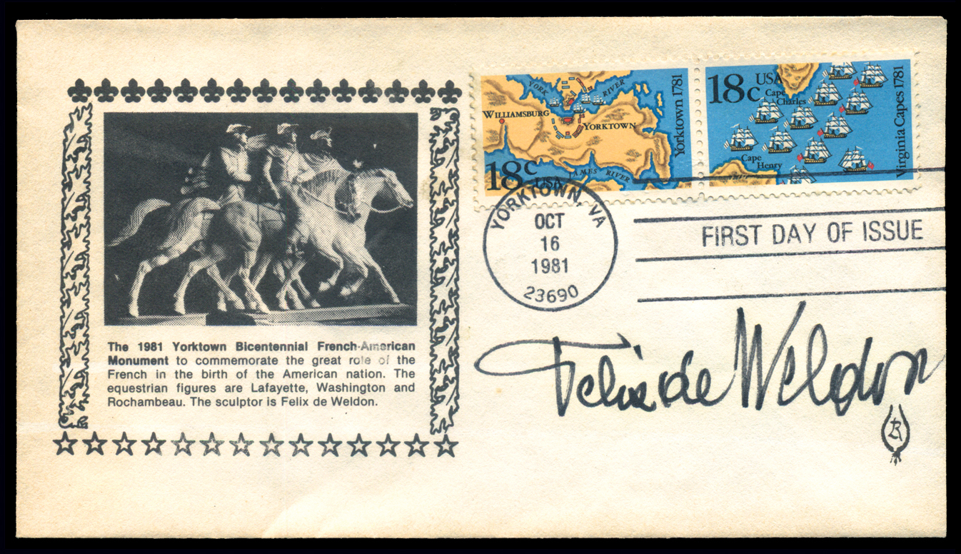 (Sculptor) Felix de Weldon (1907-2003), bronze (and other mediums) sculptor, signature on #1937-8 FDC (18¢ Battle of Yorktown and 18¢ Battle of Virginia Capes), unaddressed. The cachet is of the Yorktown Bicentennial French - American Monument, which was sculpted by him. He served in the U.S. Navy in WWII and is also known for being commissioned to create the Iwo Jima memorial sculpture, among about 1,200 others Cat($60) (Image)