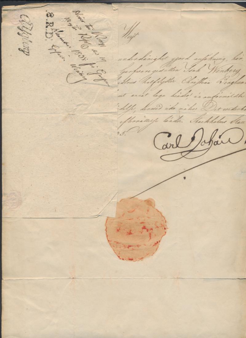 Sweden, KARL XIV JOHAN (J B BERNADOTTE) (1763–1818–1844), King of Sweden and Norway. Handwritten signature on approval of application. 8 rd Ygberg revenue stamp affixed (graded as R in Facit). Several folds, horisontal tear, wears at top and the wax seal removed. An interesting document anyway, with the revenue fees specified 1 more image is available at www.philea.se. (Image1)