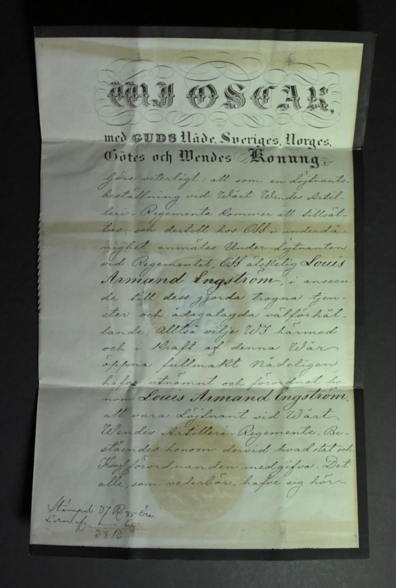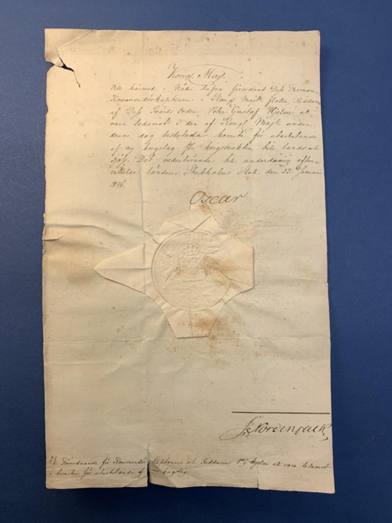 Sweden, OSKAR I (1799-1844-1859). King of Sweden and Norway. Appointment signed 'Stockholms Slott den 23 Januari 1846'. Several tears and stains. (Image1)