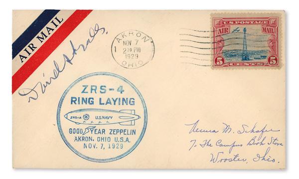 1929-32, Quartet of USS Akron Covers, comprising Nov. 7, 1929 Ring Laying (signed, David Strall (?)); Aug. 8, 1931 Christening on Airgram (central vertical file fold, split at bottom); May 8, 1932 Coast-to-Coast flight from Lakehurst, properly cacheted front and back with San Diego May 11 receiver; and Aug. 1, 1932 Tactical Training Flight with proper front and back cachets; all clean, sound apart from Airgram, Fine to Very Fine. (PDF for this Lot) (Image)