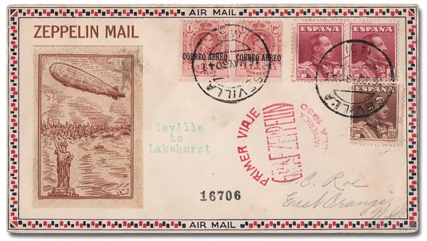 1930 South America Flight, Seville-Lakehurst (Sieger 58 B),Roessler Zeppelin envelope franked with 20pts postage (2x 343, 345 & 2x C5) canceled Seville, May 16; properly cacheted and backstamped. Michel 66A; €180 ($190). (Image)
