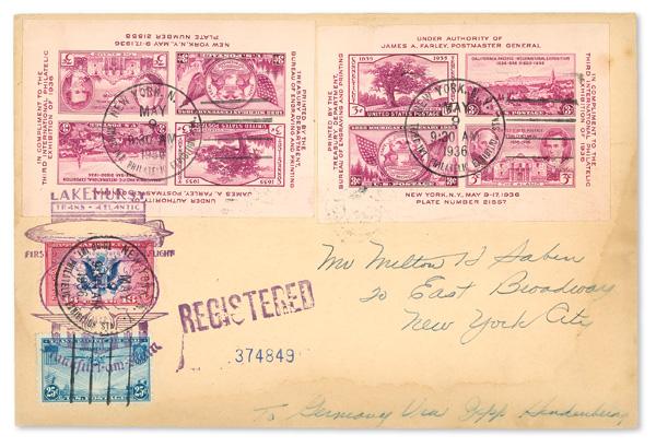 1936 (May 9), First North America Flight Cover, TIPEX-franked (Sieger 409 D), Registered cover bearing two TIPEX souvenir sheets plus #C20 and CE2 addressed to Milton Sabin in New York City; stamps all cancelled by Expo cancel with violet flight cachet, reverse with all proper backstamps including Frankfurt receiver Type 1; damp staining at bottom, Fine to Very Fine. (Image)