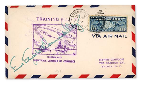 1934 (July 12), USS Macon Training Flight cover, franked by 10¢ Map and tied by Sunnyvale, Calif. duplex, with purple cachet of the Sunnyvale Chamber of Commerce, across which is written (printed?) "First Flight with Commander Wiley"; this was the training flight during which the Macon located the ships Houston and New Orleans (the former carrying President Roosevelt on a secret trip to Hawaii); having found the ships, the Macon's Sparrowhawk planes dropped newspapers and magazines to the President, near Very Fine. (Image)