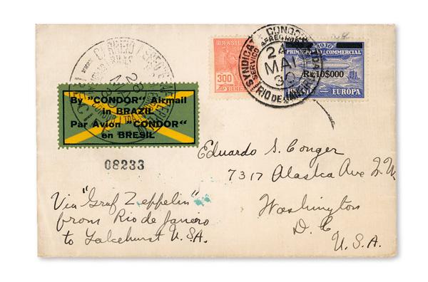 1930 (May 24), Condor/Zeppelin Flight Cover from Rio to Washington, franked by Brazil 300r rose red Mercury (#250, corner damage) and 10000r on 20000 blue Zeppelin (#4CL5) tied by Rio Condor Syndicate double-ring postmark, with bilingual "By 'Condor' Airmail in Brazil" label (Sanabria #5) alongside and tied by Recife "Correio Aereo 'Graf Zeppelin'" double-ring postmark of May 28; appropriate green Lakehurst receiver on reverse, Fine to Very Fine, an attractive cover. Sieger 59 H. Scott $400+. (Image)