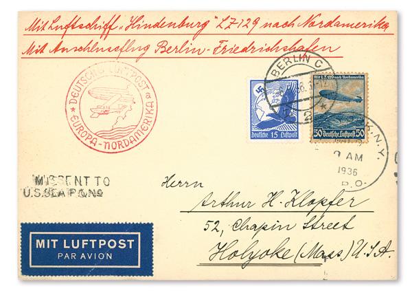 1936 (May 6) 1st North American Flight (Sieger 406A), postcard sent from Berlin and addressed to MA; Missent auxiliary marking difficult to decipher, Fine to Very Fine. (Image)