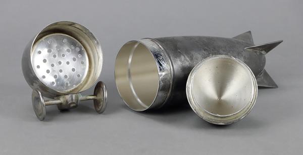 Modern "Zeppelin" Cocktail Shaker, made of a combination of stainless steel and silver plate, giving it a sleek silver finish that adds to its elegance the set includes three pieces, with a strainer for easy pouring; this original Restoration Hardware model, called the Zephyr, was manufactured in the 1990s. Shipping charges apply - weight 2.6 lbs. (Image)
