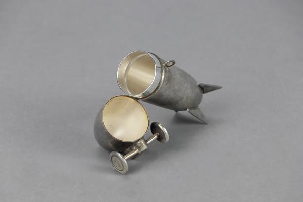 Modern "Zeppelin" Christmas Ornament, two piece Christmas ornament made of a combination of stainless steel and silver plate, by Restoration Hardware and manufactured in India in the 1990s. Shipping charges apply - weight 0.6 lbs. (Image)