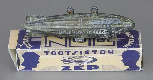 Tootsietoy Zep, originally the 4th of Tootsietoy's Buck Rogers 25th Century Rocket Ship series, this 5" long pressed metal has pulley wheels on top allow the USN Los Angeles to glide along a string; includes the original cardboard box with instructions; outstanding condition. (Image)