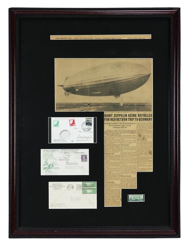 Hindenburg Wall Art, 1936 Denver Post article interestingly matted describing zeppelin refueling for return to Germany; mint "Baby Zep" and three pieces carried in the Hindenburg; richly framed in wood. Shipping charges apply - weight 7.2 lbs. (Image)
