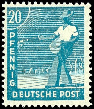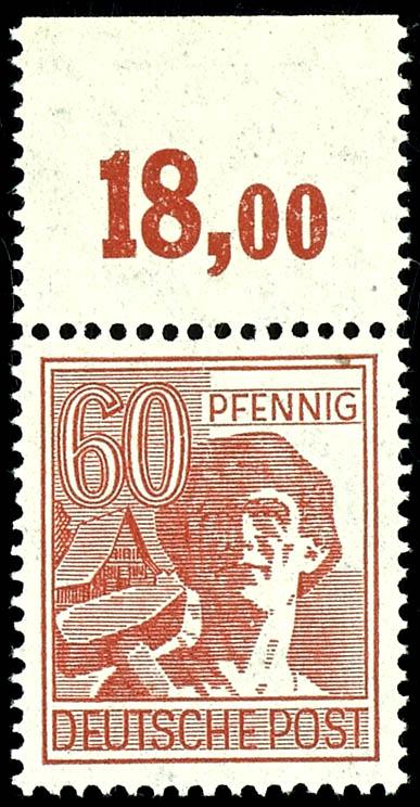 60 pfennigs worker, stamp mint never hinged from upper margin in "b" colour, perforations going through margins. Attest study group, Michel 400.- (956bPOR) Certificate