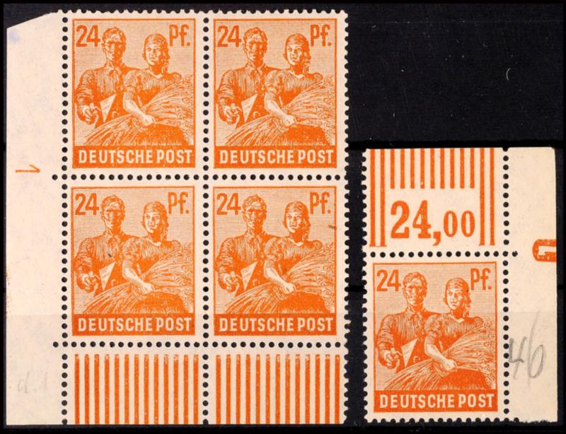 24 Pf. Arbeiter braunorange, linker unterer Eckrand-4er-Block und linke obere Bogenecke mit Druckerzeichen "1" positiv bzw. negativ, je postfrisch, Mi. 90.- (Image 1)(Image)