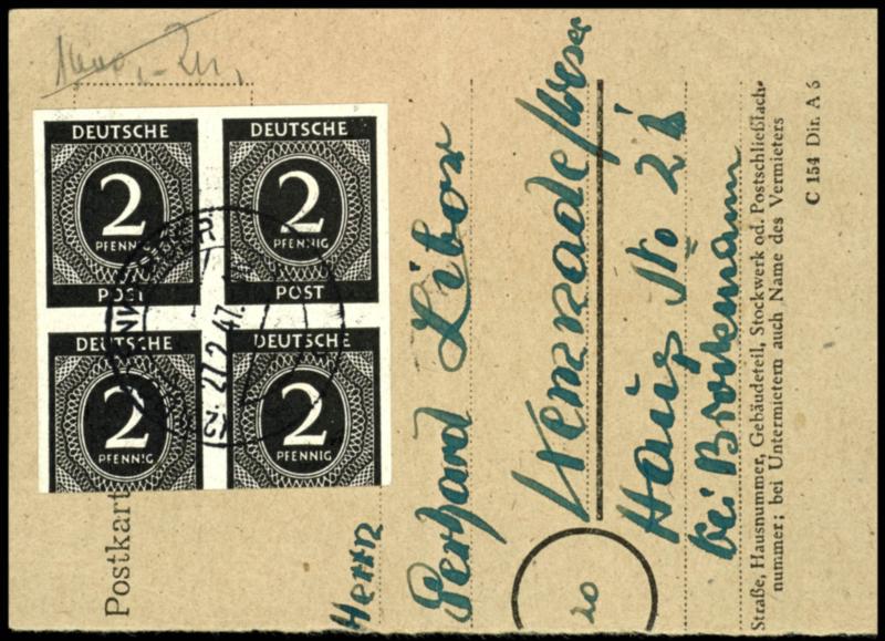 1946, 2 Pfg black drawing numbers Control Council I block of four imperforated on pieces one postcard to Kemnade, ZKr (27) BODENWERDER 27.2.47, block of four at the lower margin approximate 2 mm cut into (912U(4)) 1946, 2 Pfg schwarz Ziffernzeichnung Kontrollrat I Viererblock ungezähnt auf Ausschnitt einer Postkarte nach Kemnade, ZKr (27) BODENWERDER 27.2.47, Viererblock am Unterrand ca. 2 mm angeschnitten (Image)