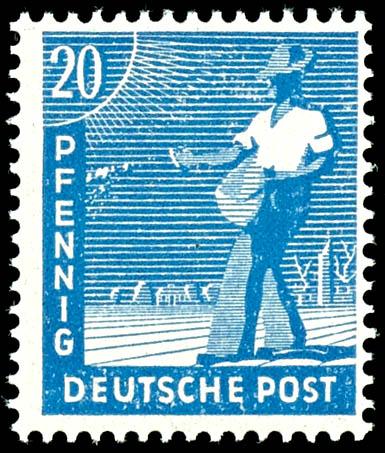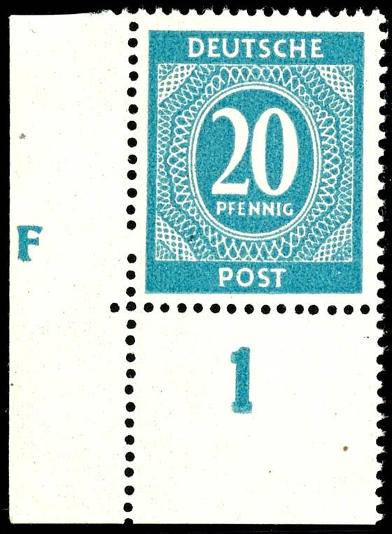 20 Pfg numerals greenish-blue, corner margin piece left at the bottom with printer signature "F", mint never hinged, Michel 250.- (924aDZ) 20 Pfg Ziffern grünlichblau, Eckrandstück links unten mit Druckerzeichen "F", postfrisch, Mi. 250.- (Image)