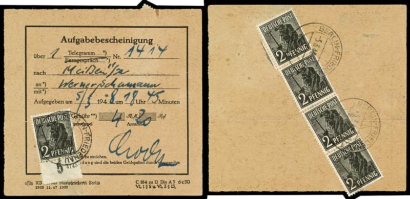 2 Pfg worker black brown, five pieces on both sides in very rare Me F version as dispatch certification for a telegram from BERLIN FRIEDENAU 5.3.48 to Meissen, superb (943(5)) 2 Pfg Arbeiter schwarzbraun, fünf Stück beidseitig in sehr seltener MeF-Version als Aufgabebescheinigung für ein Telegramm ab BERLIN FRIEDENAU 5.3.48 nach Meissen, Pracht (Image)