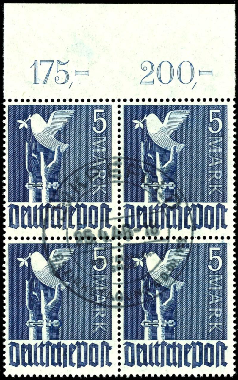5 Mk. Dove lilac ultramarine, upper margin block of four not perforated throughout, centric cancellation KREFELD, expertized Schlegel BPP, Michel 300.- (962aPOR) 5 Mk. Taube lilaultramarin, Oberrand-4er-Block ndgz., zentr. gest. KREFELD, gepr. Schlegel BPP, Mi. 300.- (Image)
