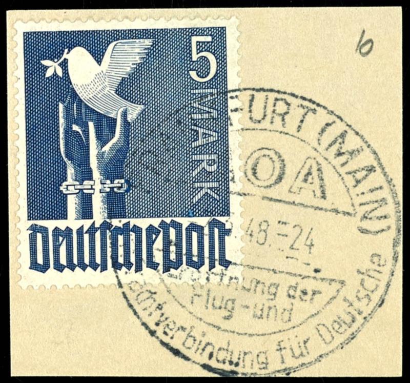 5 Mark violet ultramarine, faultless letter piece with special cancel Frankfurt, photo expertize study group to the colour determination and examination Schlegel BPP on piece, Michel 180.- (962b) Certificate 5 Mark violettultramarin, tadelloses Briefstück mit Sonderstempel Frankfurt, Fotobefund ARGE zur Farbbestimmung und Prüfung Schlegel BPP auf Briefstück, Mi. 180.- (Image)