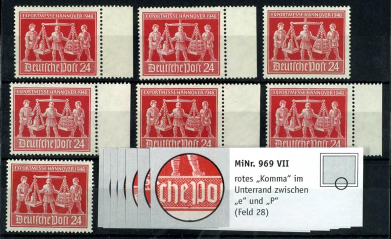 24 penny export fair Hanover, complete compilation the plate flaw I - VII, mint never hinged, very fine, for any man plate flaw decorative label with large illustration and description of the defect including field specification enclosed, Michel 235.- (969I/VII) 24 Pfennig Exportmesse Hannover, komplette Zusammenstellung der Plattenfehler I - VII, postfrisch, tadellose Erhaltung, für jeden Plattenfehler dekorativer Zettel mit großer Abbildung und Beschreibung des Fehlers inkl. Feldangabe beiliegend, Mi. 235.- (Image)