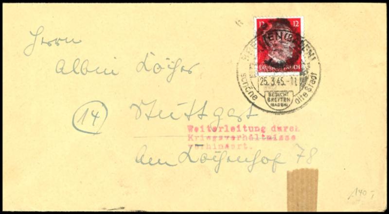 12 Pfennig Hitler (geschwärzt) auf Brief vom 25..3.45 mit nebengesetztem roten L3 "Weiterleitung durch Kriegsverhältnisse verhindert"