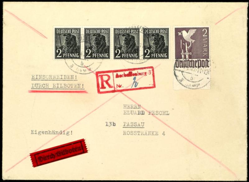 2 Pfg worker, 4 pieces, with 2 Mk dove on properly franked letter with rare combination as special delivery R personally long distance cover ASCHAFFENBURG 9.9.47 to Passau, arrival 10.9.47, complete with belonging receipt for delivery, attest Hohmann (943c(4),960a) Certificate(Image 1)(Image)