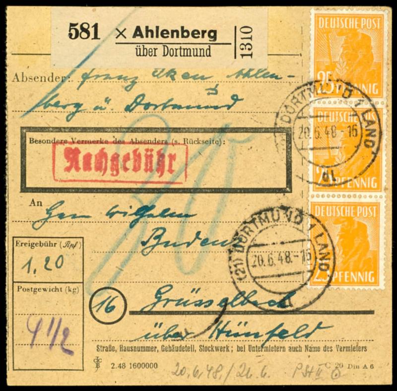 25 Pfennig Arbeiterserie (4) zusammen mit 10 Pfennig Arbeiterserie (2) auf Paketkarte mit alter RM-Währung von Ahlenberg über Dortmund nach Grüsselbach, Nachgebühr 30 Pfennig die wohl schon in neuer Währung gezahlt werden musste, Eingang 25.06