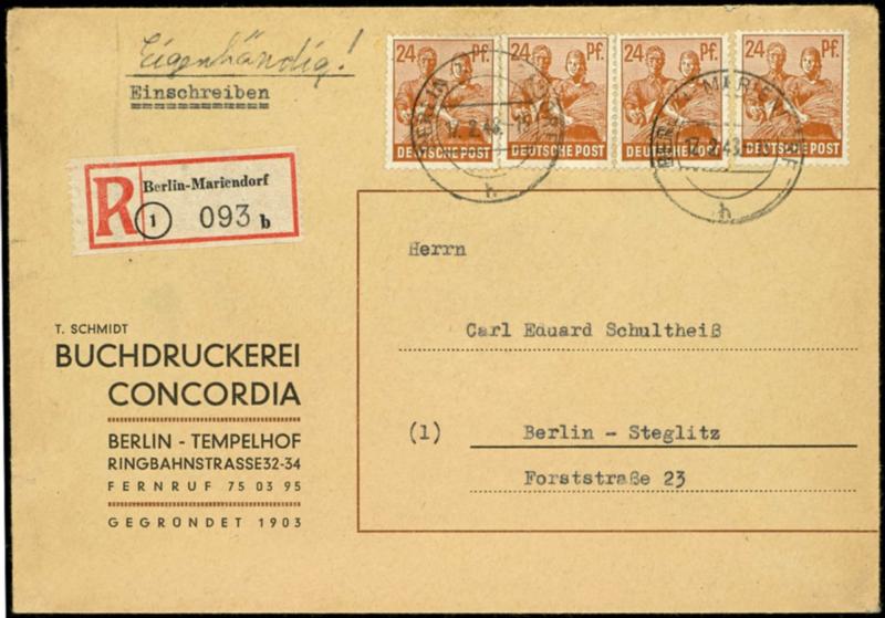 24 Pfennig Arbeiter braunorange, vier Stück in seltener MeF-Version als R-Eigenhändig-Ortsbrief BERLIN MARIENDORF 17.2.48 nach Berlin Steglitz, Ankunft 18.2.48, Fotobefund Schlegel BPP "... gute Erhaltung"