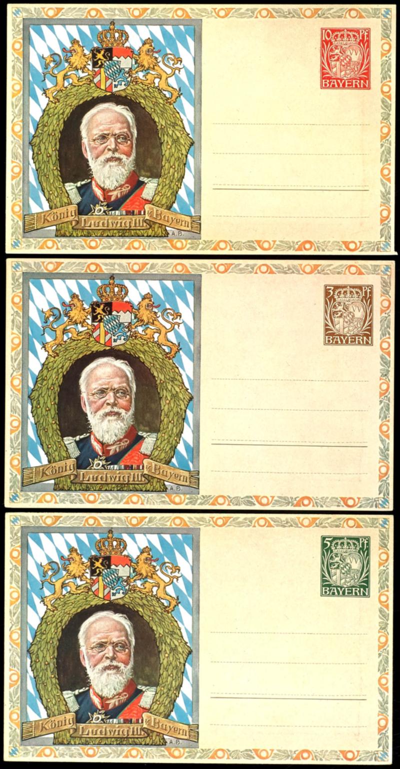 Ludwig III. König von Bayern, Privatganzsache zu 3 Pfennig. Variante 01. Dazu bildgleiche Karten zu 5 Pfennig PP 38 E11 und 10 Pfennig PP 44 E2. Alle ungebraucht.