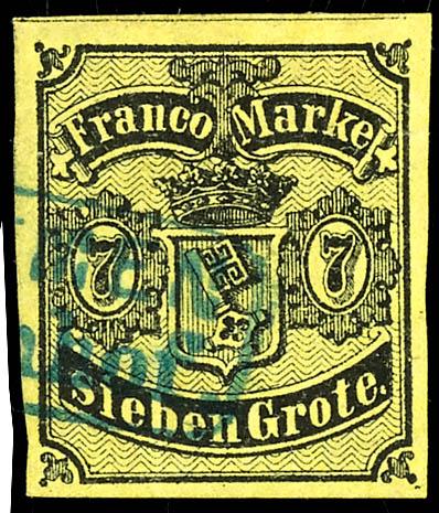 7 Grote black on reddish yellow, cancelled by blue box cancel of 2 lines "BREMEN railway station. ", fresh colours on all sides mostly with wide margins cut, right above small repaired tear in margin, photo expertize Till Neumann BPP (2025) "a decorative copy this good stamp with hereupon rarer cancel. ", Michel 900.- (3a) Certificate(Image 1)(Image)