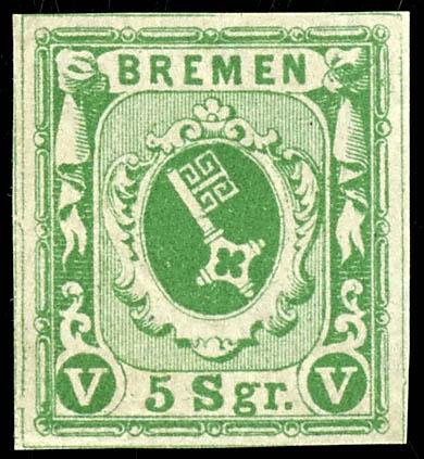 5 Silbergroschen schwarzgelbgrün, unscharfer Druck, entwertet mit schwarzem Ra2 "BREMEN" (KS 112), Mängel - angeschnitten und helle Stellen, Fotobefund Till Neumann BPP (2025), Mi. 380.-