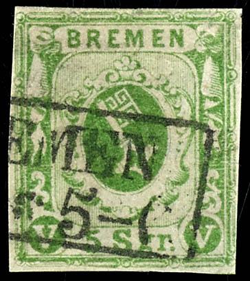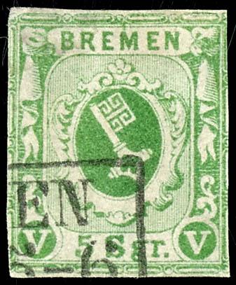 5 silver penny black yellow green, blurred printing, cancelled by black box cancel of 2 lines "BREMEN" (KS 112), defects - cut into and thin places, photo expertize Till Neumann BPP (2025), Michel 380.- (4b) Certificate(Image 1)(Image)