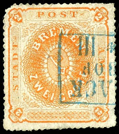 7 Grote schwarz auf rötlichgelb, entwertet mit blauem Ra2 "BREMEN Bahnhof.", farbfrisch allseits meist breitrandig geschnitten, rechts oben kleiner reparierter Randriss, Fotobefund Till Neumann BPP (2025) "Ein dekoratives Exemplar dieser guten Marke mit hierauf seltenerem Stempel.", Mi. 900.-
