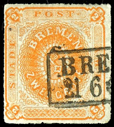 2 Grote gelborange, normales Papier, entwertet mit schwarzem Ra2 "BREMEN" (KS 107), dreiseitig nachgestochen, Fotobefund Till Neumann BPP (2025) "Echt gestempelt eine seltene Marke.", Mi. 2.200.-