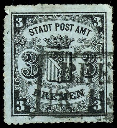 3 Grote schwarz auf blaugrau, senkrecht gestreiftes Papier, Type II, entwertet mit schwarzem Ra2 "BREMEN" (KS 120), Mängel (obere Ecken), Fotobefund Till Neumann BPP (2025), Mi. 800.-