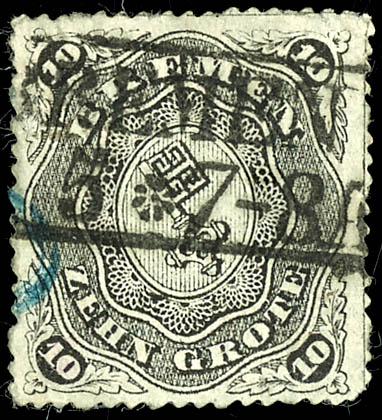 10 Grote schwarz, Durchstich D 1 I, entwertet mit schwarzem Ra2 "BREMEN" (KS 120), farbfrisch und gerade gestempelt, kleine Randfehler, Fotobefund Till Neumann BPP (2025) "Trotzdem ein dekoratives Exemplar der 2. Auflage dieser guten Marke.", Mi. 1.200.-