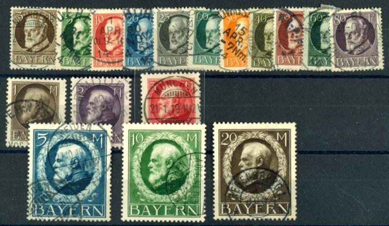 3 Pfennig - 20 Mark Ludwig, Friedensdruck, kompletter Satz von 16 Werten. Die meisten kleineren Werte Infla-geprüft, 5 Mark geprüft Helbig BPP, 10 Mark mit Stempeldatum 4.10.1915 doppelt geprüft Helbig BPP und Höchstwert 20 Mark mit Stempeldatum 1.Juni 1915 geprüft Helbig und Pfenninger BPP. Mi. 900.-