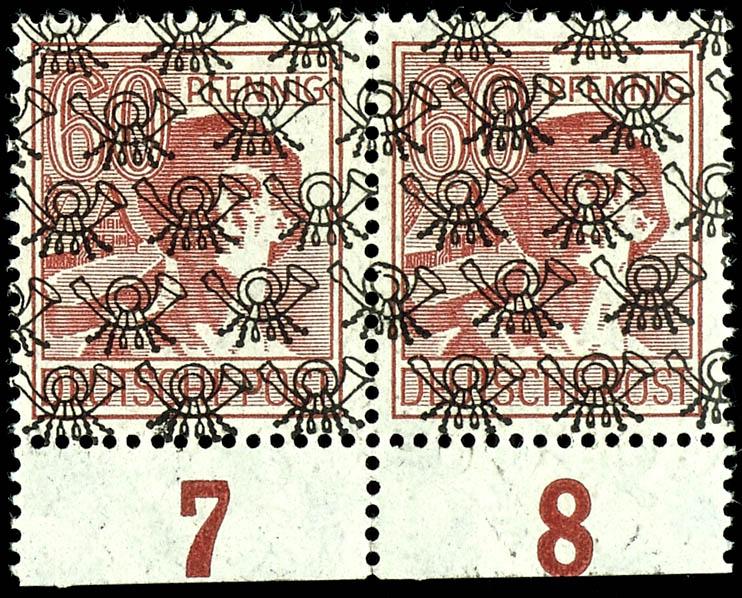 60 pfennigs worker with net pattern overprint, variety \overprint on front normal, reverse vertical\, horizontal lower margin pair, perfectly mint never hinged, photo expertize Hans Dieter Schlegel BPP \the quality is perfect, left upper corner reverse without overprint through sheet cover. \, Michel 200.- (A49IIDSI(2)) Certificate 60 Pfennig Arbeiter mit Netzaufdruck, Abart \Aufdruck auf Vorderseite normal, rückseitig senkrecht\, waagerechtes Unterrandpaar, tadellos postfrisch, Fotobefund Hans-Dieter Schlegel BPP \Die Qualität ist einwandfrei, linke obere Ecke rückseitig ohne Aufdruck durch Bogenumschlag.\, Mi. 200.- (Image)