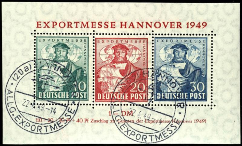 Souvenir sheet issue "export fair Hanover", cancelled by first day special cancel "Hanover 22.4.49", very fine with full original gum, expertized Schlegel BPP (on the 20 Pfg stamp) and photo expertize Hans Georg Schlegel BPP, Michel 250.- (Bl.1a) Certificate Blockausgabe "Exportmesse Hannover", entwertet mit Ersttagssonderstempel "HANNOVER 22.4.49", tadellose Erhaltung mit voller Originalgummierung, geprüft Schlegel BPP (auf der 20 Pfg Marke) und Fotoattest Hans-Georg Schlegel BPP, Mi. 250.- (Image)