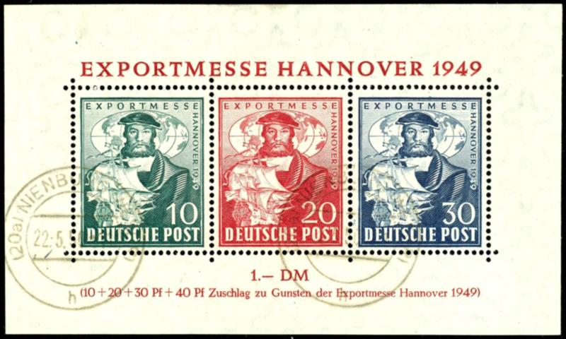 Hannover souvenir sheet, date stamp NIENBURG, expertized Schlegel, Michel 350.- (Bl.1a) Hannover-Messe-Block, Tagesstempel NIENBURG, gepr. Schlegel, Mi. 350.- (Image)
