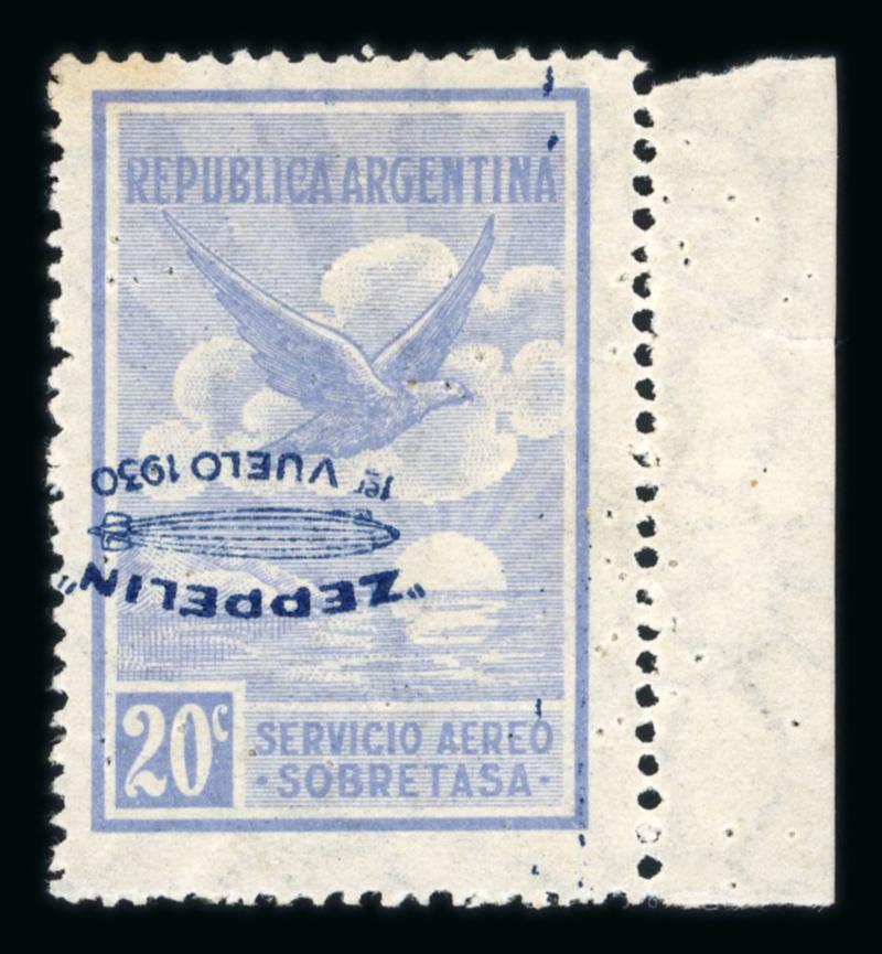 1930 20c blue with blue Zeppelin overprint inverted, believed to be a proof and only mentioned in Michel, unlisted elsewhere including Sanabria, a right-hand marginal hinged mint with the usual tiny pin holes. (Image)