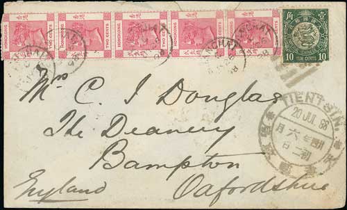 1898 (July 20) Cover to England with China 10c (corner fault) tied by barred cancel and Hong Kong 2c vertical strip of five cancelled at Hong Kong, "TIENTSIN" Dollar Chop datestamp below, reverse with "SHANGHAI" Dollar Chop c.d.s and an arrival datestamp, minor creasing, an attractive combination cover. Photo on Page 118. (Image1)