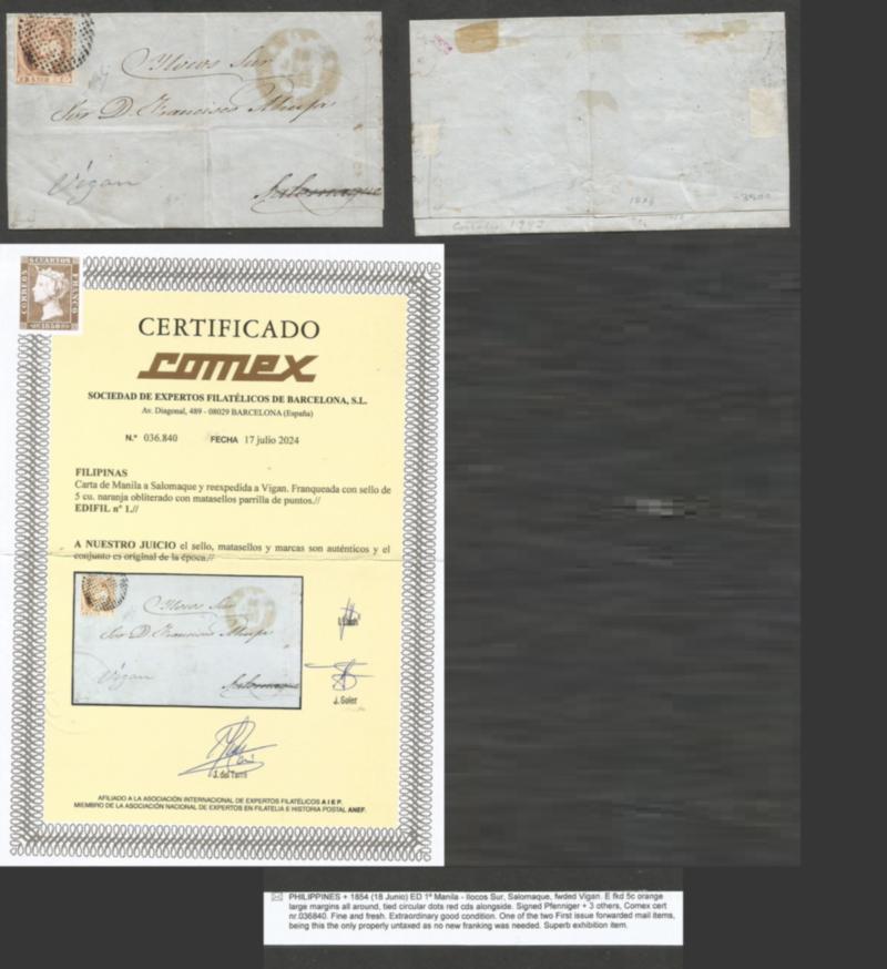 Philippines. 1854 (18 Junio) ED 1º Manila - Ilocos Sur, Salomaque, fwded Vigan. E fkd 5c orange large margins all around, tied circular dots red cds alongside. Signed Pfenniger + 3 others, Comex cert nr.036840. Fine and fresh. Extraordinary good condition. One of the two First issue forwarded mail items, being this the only properly untaxed as no new franking was needed. Superb exhibition item. (Image)