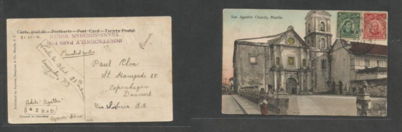 Philippines. 1911 (2 Febr) Corregidor - Denmark, Cph via Siberia - Russian. Reverse fkd ppc + rare so far down Asia for this route, with superb "Insufficiently paid for this trans - Siberian route" (xxx/RRR) Extraordinary usage. (Image)