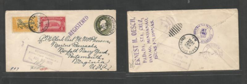 Philippines. 1933 (Aug 25) Santa Cruz, Davao - USA, Va, Portsmouth. Registered air multifkd 2c green embossed stat envelope, tied cds + R-label. Reverse transited. (Image)